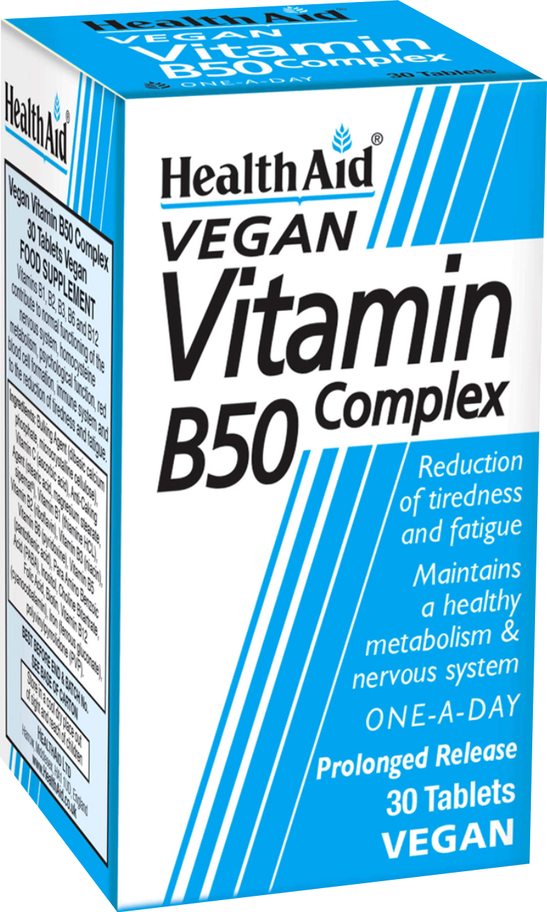 Υψηλής περιεκτικότητας σύμπλεγμα βιταμινών Β μαζί με σίδηρο και βιταμίνη C για υγιές νευρικό & πεπτικό σύστημα αλλά και υψηλά επίπεδα μεταβολισμού & ενέργειας. Ενισχύει όλες τις μεταβολικές λειτουργίες του οργανισμού και την παραγωγή ενέργειας από τις τροφές. Σημαντικό για την υγιή κατάσταση του δέρματος & των μαλλιών και για την ισορροπία των ορμονών. Παράλληλα βελτιώνει την πνευματική απόδοση και την αυτοσυγκέντρωση, ενάντια στο καθημερινό άγχος. Η σύνθεση Β50 Complex της HealthAid είναι σε ταμπλέτες βραδείας αποδέσμευσης, ώστε να απελευθερώνουν σταθερά τα θρεπτικά συστατικά κατά τη διάρκεια της ημέρας και να ελαχιστοποιείται η απώλεια των υδατοδιαλυτών βιταμινών. Κατάλληλες για όσους έχουν ευαίσθητο στομάχι. Ιδανικές για άτομα με στρεσογόνους και απαιτητικούς ρυθμούς ζωής, για όσους ακολουθούν υποθερμιδικές δίαιτες αλλά και για ηλικιωμένους, στους οποίους τόσο η παραγωγή όσο και η απορρόφηση των βιταμινών αυτών έχει μειωθεί λόγω γήρατος και φαρμακευτικών αγωγών.