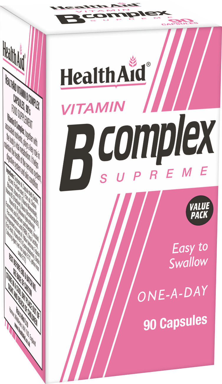 Οι Βιταμίνες του συμπλέγματος Β, είναι το κλειδί για τον ζωτικό μεταβολισμό του σώματος, ενώ συμβάλλουν σημαντικά στην ελάττωση του άγχους & της κόπωσης. Βοηθούν στη διατήρηση της υγείας κυρίως του νευρικού αλλά και του πεπτικού συστήματος και προάγουν την υγεία του δέρματος, των μαλλιών & των νυχιών. Αν και μπορούν να ληφθούν και μεμονωμένες, ο τρόπος που δρουν στο σώμα είναι κοινά συνδεδεμένος (π.χ. η Β12 προαπαιτείται για τη δράση του φυλικού οξέος στα ερυθροκύτταρα). Για το λόγο αυτό, θεωρείται πιο ολοκληρωμένη η λήψη όλου του συμπλέγματος για την κάλυψη των καθημερινών αναγκών. Το B-Complex της HealthAid δίνει σταθερή δόση όλων των βιταμινών του συμπλέγματος Β, καλά εξισορροπημένη, σε μια κάψουλα άμεσης αποδέσμευσης και εύκολη στην κατάποση. Χρήσιμο μετά από θεραπεία με αντιβίωση ή σε άτομα σε περίοδο ανάρρωσης καθώς και αλκοολικούς ή καπνιστές. Άριστο συμπλήρωμα για νευρόπονους (πχ.οσφυαλγία).