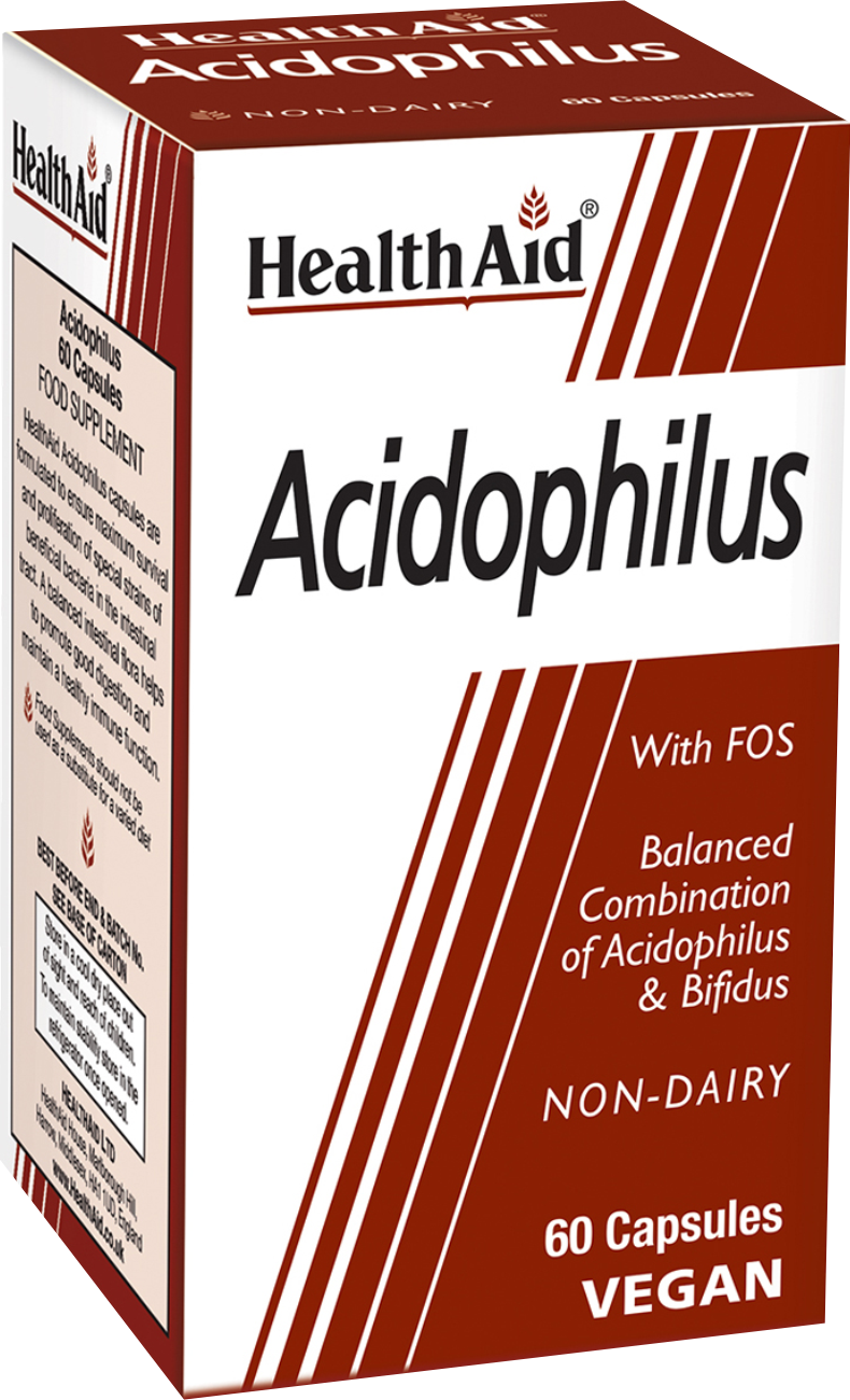 Ο Lactobacillus Acidophilus είναι το κυριότερο προβιοτικό στέλεχος, το οποίο ‘’κατοικεί’’ στον οργανισμό μας και ανήκει στην οικογένεια των λακτοβάκιλλων-οξεόφιλων . Βρίσκεται κυρίως στο λεπτό έντερο και παράγει λακτάση, ένα ένζυμο απαραίτητο για την πέψη της λακτόζης, αλλά και κάποιες ουσίες με αντιμικροβιακές και αντιμυκητιασικές ιδιότητες. Το Bifidobacterium Bifidum ανήκει στην οικογένεια των μπιφίδο-βακτηρίων, των οποίων κύριος ρόλος είναι η παραγωγή βιταμινών του συμπλέγματος Β, για τη διατήρηση της νευρολογικής λειτουργίας και του υγιούς μεταβολισμού και ανάπτυξης. Τα πρεβιοτικά (φρουκτοολιγοσακχαρίτες-FOS), είναι φυτικές ίνες και αποτελούν την τροφή των προβιοτικών, προωθούν την ανάπτυξη των ωφέλιμων βακτηρίων και ενισχύουν την υγεία και την ανοσία της εντερικής χλωρίδας. Το Acidophilus της HealthAid είναι συνδυασμός από τα παραπάνω προβιοτικά στελέχη σε ποσότητα 100 εκατομμυρίων/κάψουλα, μαζί με πρεβιοτικά, για καλύτερη ανάπτυξη προβιοτικής καλλιέργειας. Συνιστάται προληπτικά για την διατήρηση υγιούς εντερικής χλωρίδας η οποία βοηθά στην πέψη και στην γενικότερη καλή υγεία του εντέρου και του οργανισμού. Ιδανικό για μακροχρόνια λήψη, σε περιπτώσεις δυσανεξίας στη λακτόζη, φτωχού ανοσοποιητικού, ανισορροπίας pH εντέρου, αλλά και σε σύνδρομο χρόνιας κόπωσης, που μπορεί να οφείλεται σε έλλειψη βιταμινών του συμπλέγματος Β.