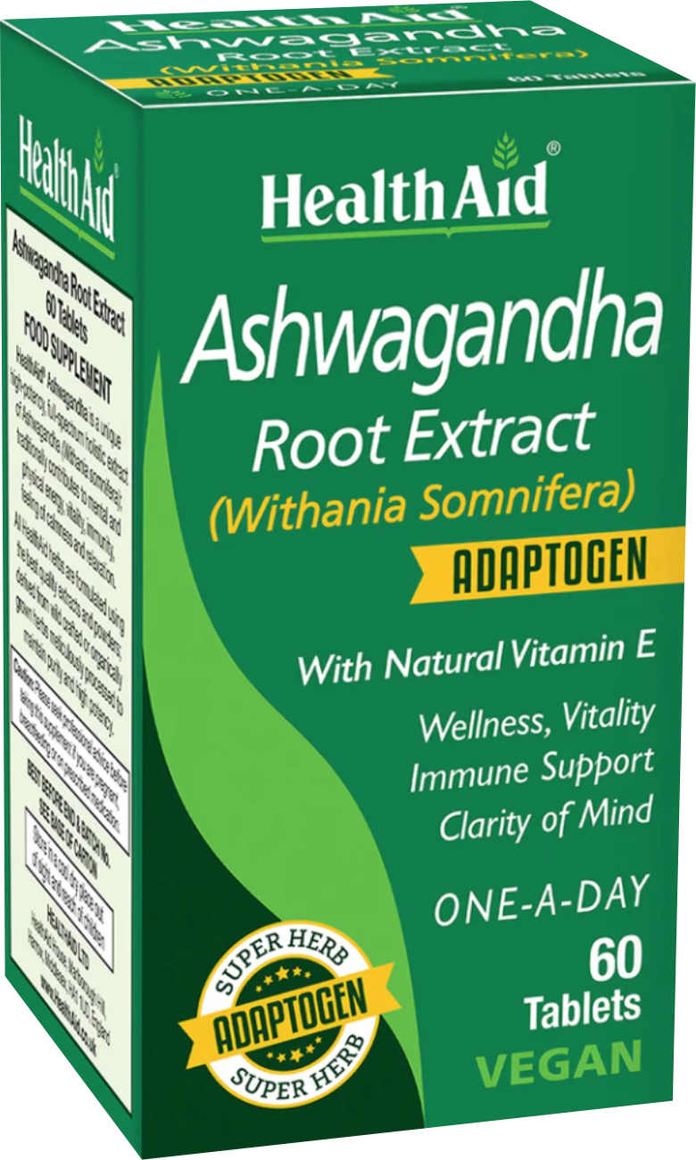Πρόκειται για ένα βότανο, γνωστό και ως Ινδικό Ginseng, η ρίζα του οποίου έχει προσαρμοσιογόνο δράση που βοηθάει το σώμα να προσαρμοστεί σε αγχώδεις καταστάσεις. Εμφανίζει ισχυρές αντιοξειδωτικές ιδιότητες, χάρη στις οποίες υποστηρίζει τη διατήρηση της υγείας του ανοσοποιητικού συστήματος και τη γενική τόνωση του οργανισμού. Οι ουσίες της ρίζας που έχουν μελετηθεί περισσότερο είναι οι withanolides και σε αυτές αποδίδονται οι ευεργετικές ιδιότητες για την καλή εγκεφαλική λειτουργία, την υγεία του νευρικού συστήματος, τις σεξουαλικές επιδόσεις, τη ρύθμιση ορμονών, την υγεία του θυρεοειδή, κ.α. Το Ashwagandha Root Extract της HealthAid είναι τιτλοδοτημένο εκχύλισμα από υψηλής ποιότητας και καθαρότητας ρίζας του βοτάνου, με μεγάλη περιεκτικότητα σε withanolides (5,25mg) εμπλουτισμένο με φυσική βιταμίνη Ε. Κατάλληλο για όσους επιθυμούν ν’ αυξήσουν τα επίπεδα αντοχής, ενέργειας και ταυτόχρονα την πνευματική διαύγεια.