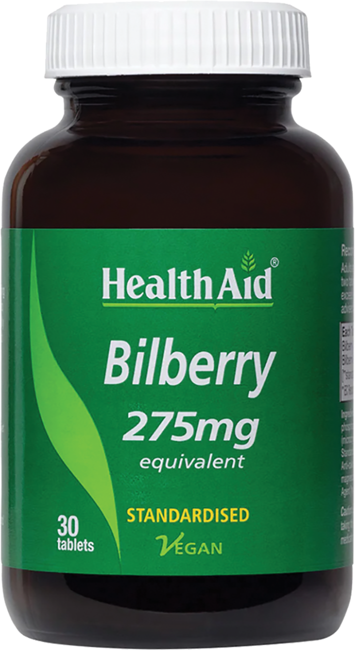 Καρπός (Vaccinium Myrtillus) γνωστός για τις ευεργετικές του ιδιότητες στην καρδιαγγειακή υγεία, στη ρύθμιση του γλυκαιμικού δείκτη και κυρίως στην διατήρηση της υγείας της όρασης. Κατά τον 2ο Παγκόσμιο Πόλεμο, δόθηκε μεγάλη επιστημονική σημασία, γιατί το έδιναν στους πιλότους της RAF, κατά τη διάρκεια νυχτερινών αποστολών. Το μπλε χρώμα του ώριμου καρπού μαρτυρά την ύπαρξη ισχυρών αντιοξειδωτικών ουσιών, γνωστών ως ανθοκυανοσίδες. Έρευνες έχουν δείξει ότι αυτά τα αντιοξειδωτικά σταθεροποιούν τις ίνες κολλαγόνου και προωθούν την παραγωγή του, ενώ παράλληλα απομακρύνουν τις ελεύθερες ρίζες, οι οποίες διασπούν το κολλαγόνο και προκαλούν διάφορες εκφυλίσεις όπως, ωχράς κηλίδας, καταρράκτη και απώλεια περιφερικής όρασης (γλαύκωμα). Επίσης προωθούν τη μικροκυκλοφορία και την οξυγόνωση στα τριχοειδών αγγεία του ματιού και εμφανίζουν συγγένεια με την χρωστική του αμφιβληστροειδούς, που χρησιμοποιείται από τα κύτταρα για την προσαρμογή των ματιών στο έντονο φως (ημεραλωπία) και το σκοτάδι (νυκταλωπία). Λόγω της θετικής επίδρασης στον διαβήτη, συμβάλλει και στην αντιμετώπιση διαβητικής αμφιβληστροπάθειας. Το Bilberry της HealthAid παρασκευάζεται με άριστες προδιαγραφές, από την καλύτερη ποιότητα εκχυλίσματος Μύρτιλου, τιτλοδοτημένο σε τουλάχιστον 25% ανθοκυανιδίνες, για μέγιστο αποτέλεσμα. Πέραν των ιδιοτήτων του, για αποτελεσματική αντιμετώπιση των οξειδωτικών βλαβών και παθήσεων του αμφιβληστροειδούς, αποτελεί χρήσιμο συμπλήρωμα στην διατήρηση της υγιούς μικροκυκλοφορίας (κιρσοί, αιμορροΐδες).
