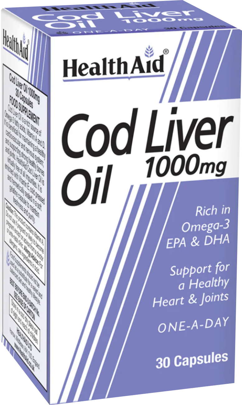 Το μουρουνέλαιο είναι το λάδι που παραλαμβάνεται από το συκώτι του μπακαλιάρου και είναι πλούσιο σε Ωμέγα 3 πολυακόρεστα λιπαρά οξέα (EPA & DHA), τα οποία συμβάλλουν στην διατήρηση της υγείας της καρδιάς, του νευρικού συστήματος και την ευλυγισία των αρθρώσεων. Είναι επίσης πλούσια φυσική πηγή των βιταμινών Α & D, οι οποίες βοηθούν στην υγεία της όρασης, των μαλλιών, του δέρματος, του ανοσοποιητικού, των δοντιών, των ούλων και προωθούν την υγιή σκελετική ανάπτυξη. Το Cod Liver Oil 1000mg της HealthAid είναι προϊόν ψυχρής πίεσης (cold pressed), απαλλαγμένο από προσμίξεις & τοξίνες. Είναι εμπλουτισμένο με βιταμίνη Ε για να προστατεύονται τα Ωμεγα 3 από την οξείδωση, τα οποία είναι ερμητικά κλειστά σε μαλακές κάψουλες, για να διατηρούν την φρεσκάδα και την καθαρότητά τους.