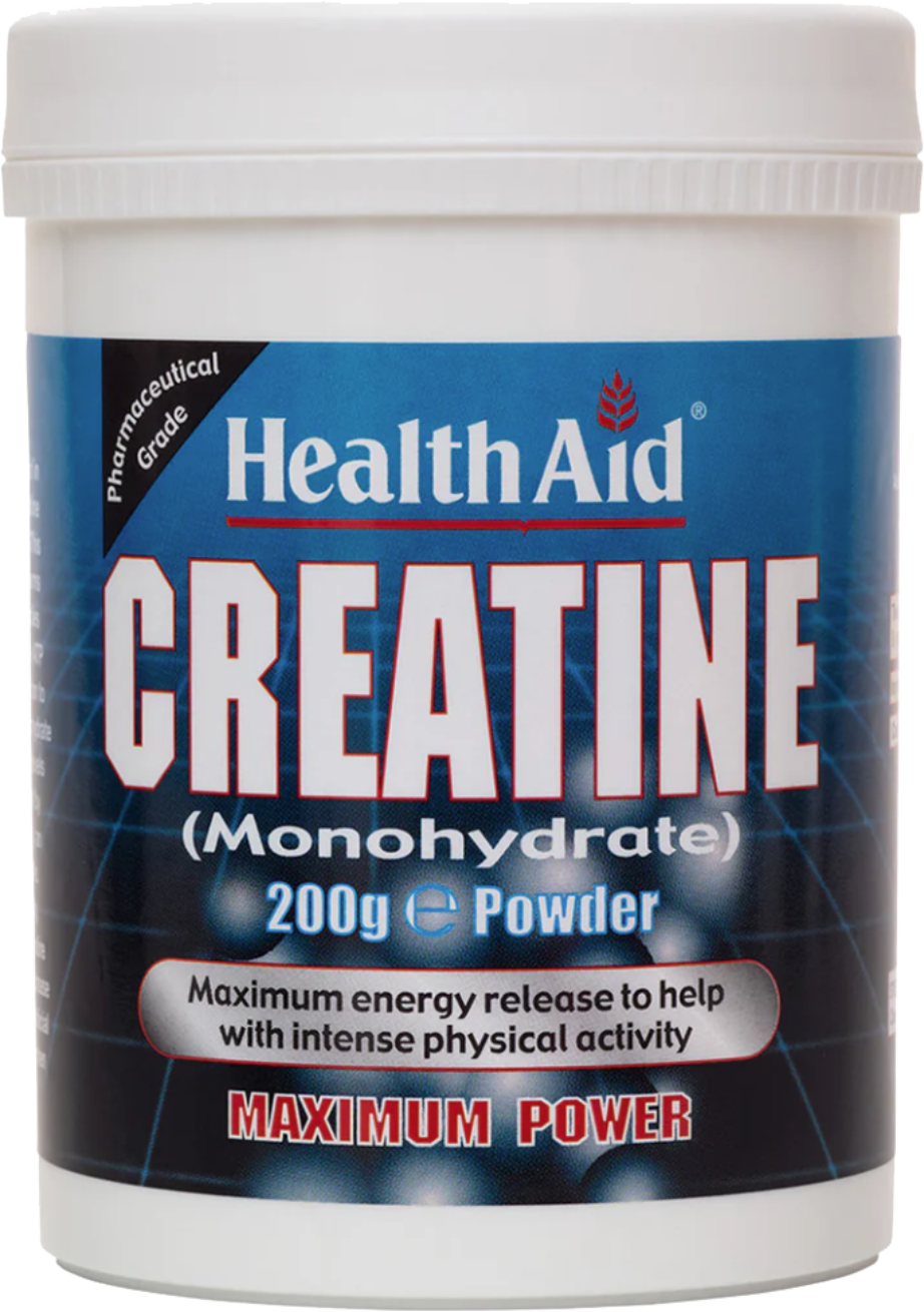 Αυξάνει τη σωματική επίδοση σε επαναλήψεις ασκήσεων μικρής διάρκειας & υψηλής έντασης. Μόλις εισέλθει στον οργανισμό μετατρέπεται σε φωσφοκρεατίνη και αποθηκεύεται στα κύτταρα των μυών. Η φωσφοκρεατίνη είναι απαραίτητη για την σύνθεση ΑΤΡ, δηλαδή την παραγωγή ενέργειας από τον οργανισμό. Με αυτόν τον τρόπο βελτιώνει την απόδοση κατά τη διάρκεια της άσκησης, επιτρέποντας περισσότερο χρόνο προπόνησης για την αύξηση της μυϊκής μάζας. Η Creatine της HealthAid είναι υψηλής καθαρότητας (pharmaceutical grade), στη μονοϋδρική μορφή της για καλύτερη αξιοποίηση από τον οργανισμό. Gluten/Dairy/Sugar Free
