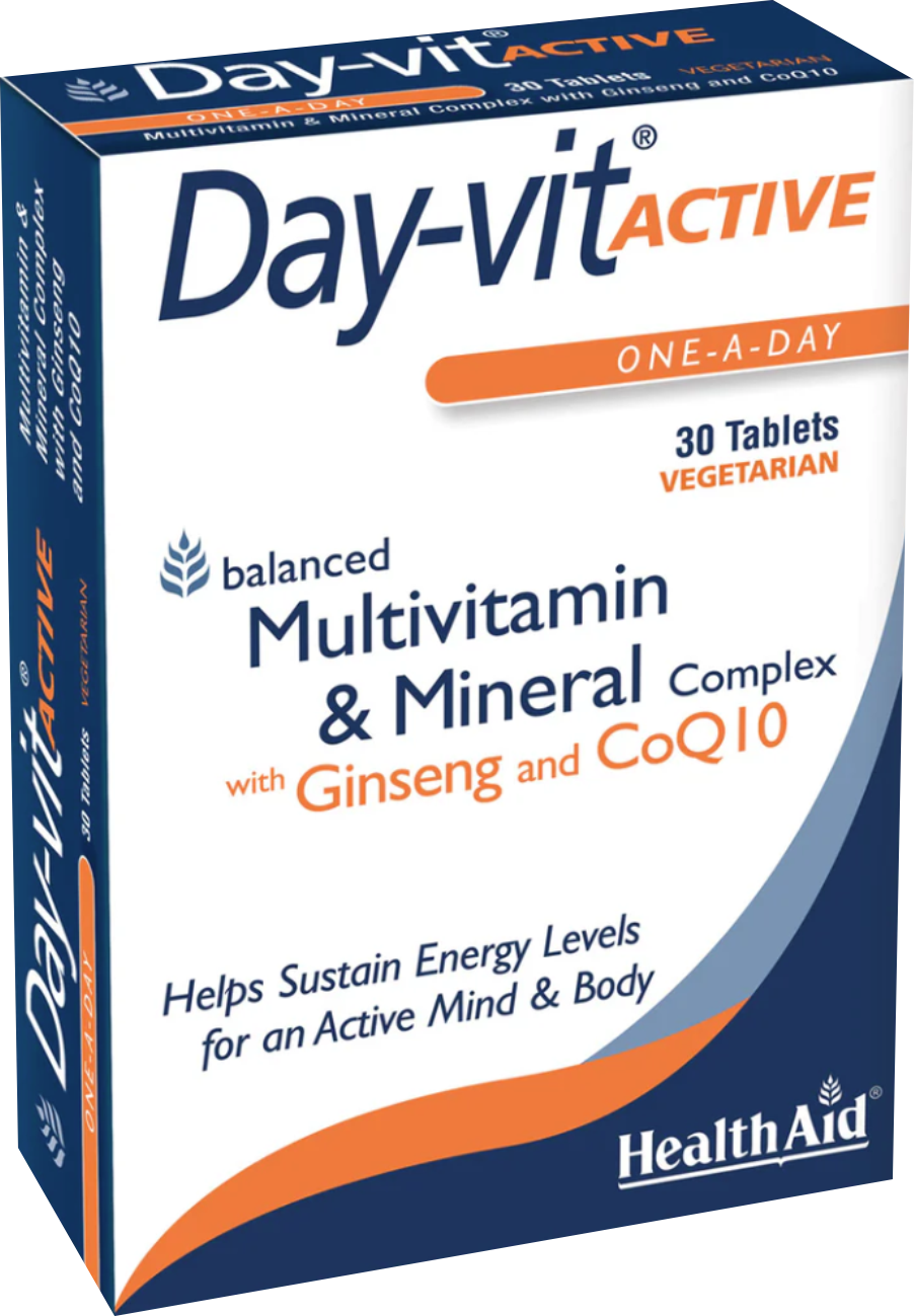 Ειδική σύνθεση extra ενεργειακής υποστήριξης με βιταμίνες μέταλλα, ιχνοστοιχεία, αμινοξέα, Συνένζυμο Q10 & Κορεάτικο Τζίνσενγκ (Panax), που προστατεύει τον οργανισμό από διατροφικές ελλείψεις & το εφοδιάζει με όλα τα απαραίτητα θρεπτικά συστατικά σε καθημερινές απαιτητικές καταστάσεις. Το Συνένζυμο Q10 είναι γνωστό αντιοξειδωτικό και έχει πρωταρχικό ρόλο στην παραγωγή κυτταρικής ενέργειας με την οποία εφοδιάζει το νευρομυϊκό σύστημα. Το Κορεάτικο Τζίνσενγκ (Panax) είναι παραδοσιακό φυσικό τονωτικό του Ειδική σύνθεση extra ενεργειακής υποστήριξης με βιταμίνες μέταλλα, ιχνοστοιχεία, αμινοξέα, Συνένζυμο Q10 & Κορεάτικο Τζίνσενγκ (Panax), που προστατεύει τον οργανισμό από διατροφικές ελλείψεις & το εφοδιάζει με όλα τα απαραίτητα θρεπτικά συστατικά σε καθημερινές απαιτητικές καταστάσεις. Το Συνένζυμο Q10 είναι γνωστό αντιοξειδωτικό και έχει πρωταρχικό ρόλο στην παραγωγή κυτταρικής ενέργειας με την οποία εφοδιάζει το νευρομυϊκό σύστημα. Το Κορεάτικο Τζίνσενγκ (Panax) είναι παραδοσιακό φυσικό τονωτικό του σώματος & των εγκεφαλικών λειτουργιών που ενισχύει την απόδοση. Το Day-vit Active της HealthAid είναι χρήσιμο σε όσους θέλουν extra τόνωση & ενέργεια, έχουν έντονες σωματικές & πνευματικές δραστηριότητες σε καθημερινή βάση και δεν ακολουθούν ισορροπημένη διατροφή. Ιδανικό για αθλητές & αθλούμενους, καθώς βοηθά στην ενίσχυση της επίδοσης & του μυϊκού τόνου, αλλά και στην αντιμετώπιση του Stress.