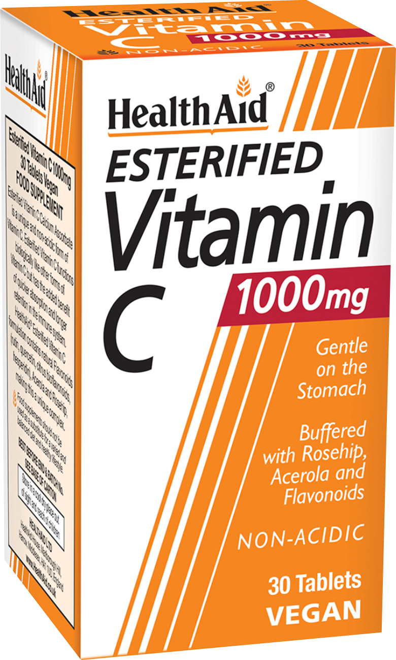 Αποτελεί μια διαφορετική μορφή της βιταμίνης, καθώς δεν βρίσκεται με τη δομή ασκορβικού οξέος αλλά ως ασκορβικό ασβέστιο, κάτι που έχει ως αποτέλεσμα να απορροφάται και να παραμένει στον οργανισμό σε πολύ μεγαλύτερο βαθμό. Επίσης, αυτή η μορφή δεν είναι καθόλου όξινη και είναι κατάλληλη για όσους έχουν υπερευαίσθητο γαστρεντερικό σύστημα. Κατάλληλες για περιπτώσεις ενίσχυσης του ανοσοποιητικού, ενώ είναι ιδιαίτερα χρήσιμες στους ηλικιωμένους, οι οποίοι εμφανίζουν μειωμένη απορρόφηση θρεπτικών συστατικών, χωρίς να επιβαρύνουν το στομάχι. Οι εξισορροπημένες συνθέσεις ESTERIFIED Vitamin C 1000mg της HealthAid, είναι εμπλουτισμένες με τα βιοφλαβονοειδή Εσπεριδίνη, Ρουτίνη & Κουερσετίνη, τα οποία ενισχύουν ακόμα περισσότερο την απορρόφησή της, ενώ παράλληλα συμβάλλουν στην ελαστικότητα των αγγείων και επιπλέον καρπό αγριοτριανταφυλλιάς & ασερόλα, αποδίδοντας επιπλέον βιταμίνη C, χωρίς να προκαλούν ερεθισμό ή στομαχικές διαταραχές.