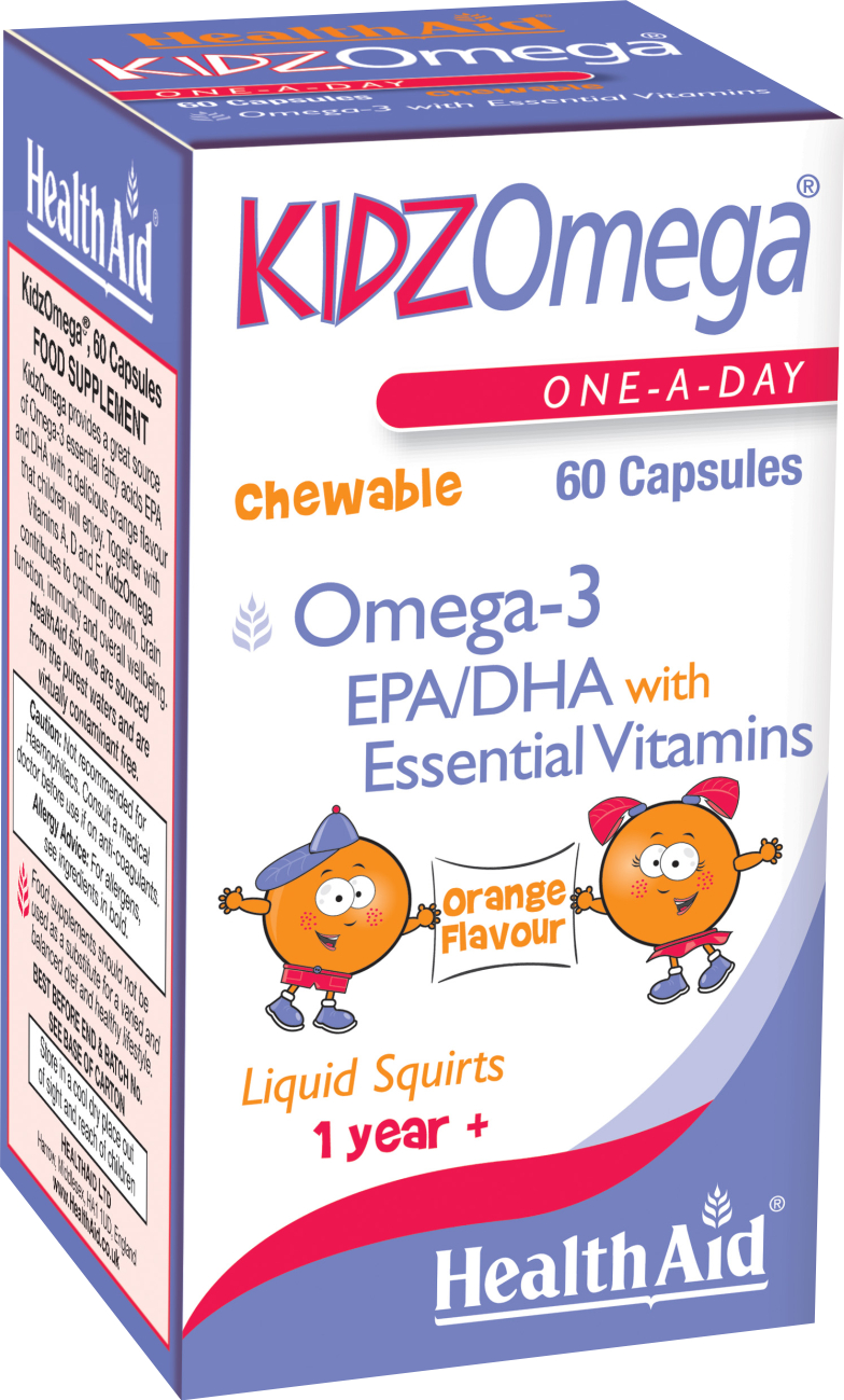 Τα Ωμέγα 3 λιπαρά οξέα, είναι απαραίτητα για τον αναπτυσσόμενο οργανισμό και η σημασία τους κατά την εμβρυϊκή, τη βρεφική, την παιδική και την εφηβική ηλικία έχει φανεί από πληθώρα μελετών. Ειδικότερα στις μικρές ηλικίες, αφορά τόσο την ανάπτυξη του εγκεφάλου, τις γνωστικές λειτουργίες, τη συγκέντρωση, τη σχολική απόδοση και τη συμπεριφορά, όσο και την καλή υγεία του καρδιαγγειακού συστήματος, προστατεύοντας τον οργανισμό κατά των χρόνιων νοσημάτων φθοράς από νωρίς. Γι’ αυτό συστήνεται η διατροφή των μικρών μας φίλων να περιλαμβάνει τρόφιμα όπως λιπαρά ψάρια (σαρδέλες, κολιός, πέστροφα), ξηρούς καρπούς (καρύδια, αμύγδαλα). Η συμπληρωματική χορήγηση Ωμέγα 3 λιπαρών κρίνεται απαραίτητη κυρίως σε παιδιά που δεν έχουν επαρκή διαιτητική πρόσληψη, γεγονός πολύ συνηθισμένο, γιατί τα περισσότερα παιδιά δεν καταναλώνουν ψάρια λόγω γεύσης. Το KIDZOmega της HealthAid μασώμενο με γεύση πορτοκάλι περιέχει υψηλής ποιότητας & καθαρότητας Ωμέγα 3 (EPA/DHA) με τις απαραίτητες βιταμίνες A, D, C, E & Folic Acid για τη σωστή ανάπτυξη του οργανισμού. Απαραίτητα σε περιόδους πνευματικής καταπόνησης, όπως οι εξετάσεις ή το διάβασμα, αυξάνουν τη συγκέντρωση και την ψυχοκινητική εξέλιξη, τροφοδοτούν και βοηθούν στην ανάπτυξη του εγκεφάλου και οξύνουν τα αντανακλαστικά. Ιδανικά σε περιπτώσεις παιδιών με υπερκινητικότητα, ελλιπή συγκέντρωση και επιθετικότητα.