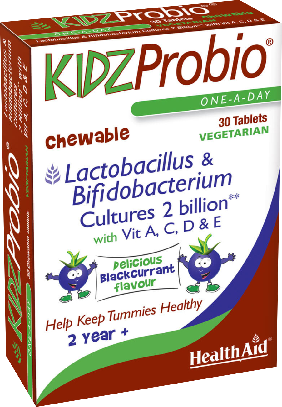 Τα προβιοτικά είναι φιλικά βακτήρια, τα οποία βρίσκονται φυσικά στον οργανισμό μας και δρουν προς όφελός του για την διατήρηση της εντερικής χλωρίδας, η οποία είναι υπεύθυνη για την γαστρεντερική και την γενικότερη υγεία του οργανισμού. Σύμφωνα με έρευνες, διατάραξη της εντερικής χλωρίδας μπορεί να προκληθεί από διάφορες καταστάσεις όπως η λήψη αντιβιοτικών, η αλλαγή διατροφικών συνηθειών, η αλλαγή περιβάλλοντος κ.α. Τα αποτελέσματα της διατάραξης αυτής εμφανίζονται μέσω διαταραχών όπως διάρροια ή δυσκοιλιότητα, επιβαρύνοντας περισσότερο τον οργανισμό και ιδιαίτερα σε περιπτώσεις παιδιών όπου ο οργανισμός είναι αρκετά πιο ευαίσθητος. Επιπλέον η εντερική χλωρίδα την οποία διατηρούν τα προβιοτικά, ρυθμίζει την απορρόφηση των περισσότερων θρεπτικών συστατικών (βιταμίνες, μέταλλα, ιχνοστοιχεία κ.α) που απαιτούνται για την υγιή ανάπτυξη. Το KidzProbio της HealthAid περιέχει 5 είδη προβιοτικών στελεχών, από 2 οικογένειες (Lactobacillus & Bifidobacterium), υψηλών προδιαγραφών για παιδιά, σε ποσότητα 2 δισεκατομμυρία/ταμπλέτα, εμπλουτισμένο με βιταμίνες A, C, D & E για τη διατήρηση της φυσιολογικής λειτουργίας της εντερικής μικροχλωρίδας και την υγιή ανάπτυξη. Σε μασώμενες ταμπλέτες με ευχάριστη γεύση φραγκοστάφυλου.