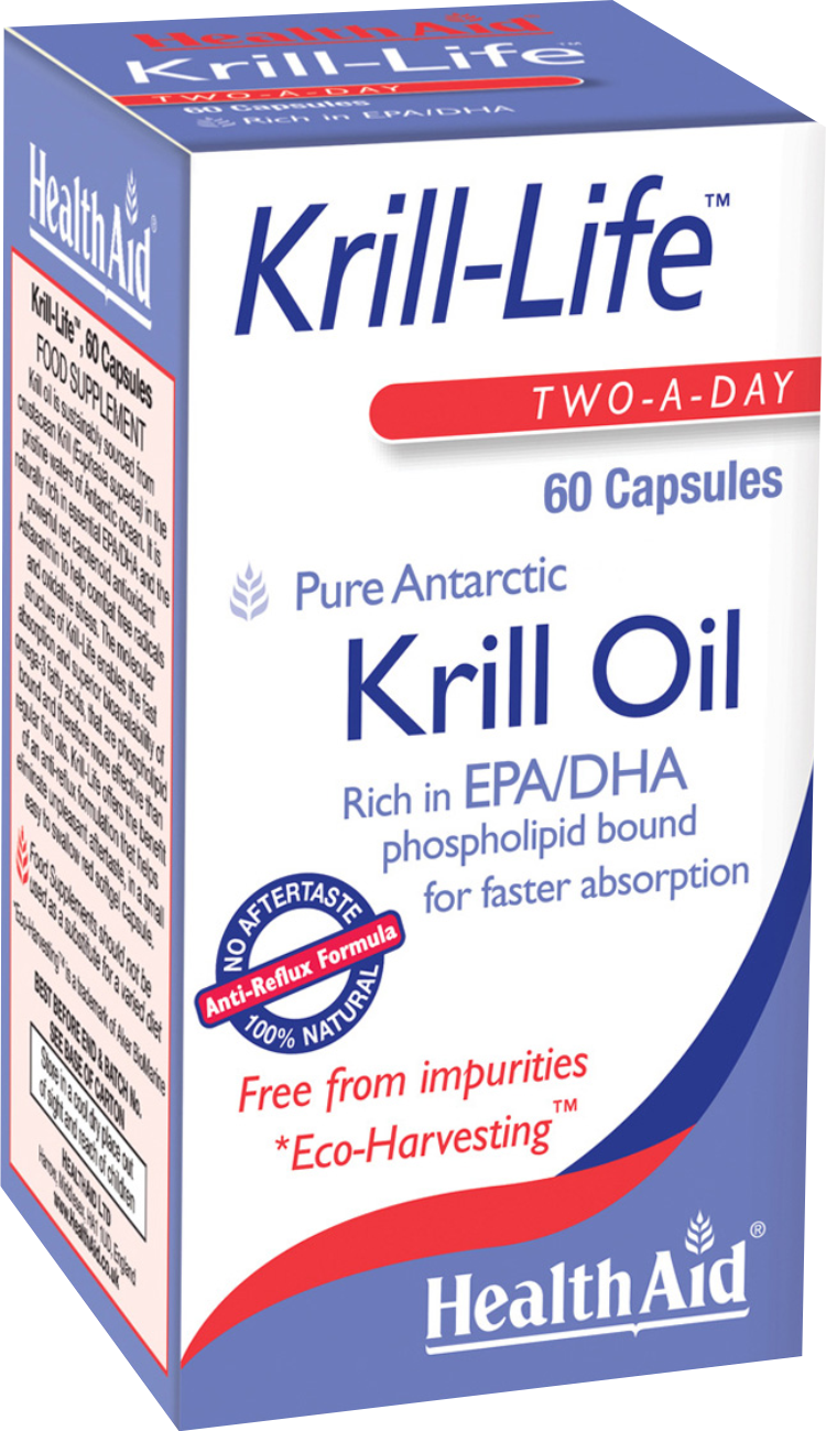 Το Έλαιο Krill είναι πλούσια πηγή Ωμέγα 3 από οστρακόδερμα (Euphasia Superba), είδος ζωοπλαγκτόν που ζουν στα αμόλυντα νερά της Ανταρκτικής θάλασσας. Τα Ωμέγα 3(EPA/DHA) του Krill είναι με τη μορφή φωσφολιπιδίων, την ίδια μορφή που έχουν και οι κυτταρικές μεμβράνες του οργανισμού, κάτι που μεγιστοποιεί την απορρόφηση, αυξάνοντας παράλληλα και τη βιοδιαθεσιμότητα. Περιέχει Ασταξανθίνη, ένα καροτενοειδές με ισχυρές αντιοξειδωτικές ιδιότητες κατά των ελευθέρων ριζών και ιδιαίτερα για την προστασία των ματιών, ενώ παράλληλα προστατεύει τα Ωμέγα 3 από την οξείδωση. Το Krill-life της HealthAid είναι 100% αγνό έλαιο Κριλ, οικολογικής συλλογής (eco-harvesting), μοριακής απόσταξης, απαλλαγμένο από κατάλοιπα, διοξίνες, προσμίξεις και βαρέα μέταλλα. Ειδική Anti- Reflux σύνθεση για την αποφυγή οποιασδήποτε επίγευσης. Συνιστάται για υγιή καρδιακή λειτουργία, έλεγχο τριγλυκεριδίων & χοληστερίνης, την προώθηση εγκεφαλικών λειτουργιών (αντίληψη, μνήμη), την ενίσχυση της όρασης και τη μείωση των φλεγμονών στις αρθρώσεις.