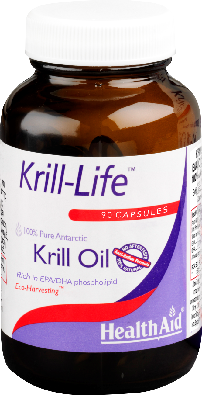 Το Έλαιο Krill είναι πλούσια πηγή Ωμέγα 3 από οστρακόδερμα (Euphasia Superba), είδος ζωοπλαγκτόν που ζουν στα αμόλυντα νερά της Ανταρκτικής θάλασσας. Τα Ωμέγα 3(EPA/DHA) του Krill είναι με τη μορφή φωσφολιπιδίων, την ίδια μορφή που έχουν και οι κυτταρικές μεμβράνες του οργανισμού, κάτι που μεγιστοποιεί την απορρόφηση, αυξάνοντας παράλληλα και τη βιοδιαθεσιμότητα. Περιέχει Ασταξανθίνη, ένα καροτενοειδές με ισχυρές αντιοξειδωτικές ιδιότητες κατά των ελευθέρων ριζών και ιδιαίτερα για την προστασία των ματιών, ενώ παράλληλα προστατεύει τα Ωμέγα 3 από την οξείδωση. Το Krill-life της HealthAid είναι 100% αγνό έλαιο Κριλ, οικολογικής συλλογής (eco-harvesting), μοριακής απόσταξης, απαλλαγμένο από κατάλοιπα, διοξίνες, προσμίξεις και βαρέα μέταλλα. Ειδική Anti- Reflux σύνθεση για την αποφυγή οποιασδήποτε επίγευσης. Συνιστάται για υγιή καρδιακή λειτουργία, έλεγχο τριγλυκεριδίων & χοληστερίνης, την προώθηση εγκεφαλικών λειτουργιών (αντίληψη, μνήμη), την ενίσχυση της όρασης και τη μείωση των φλεγμονών στις αρθρώσεις.