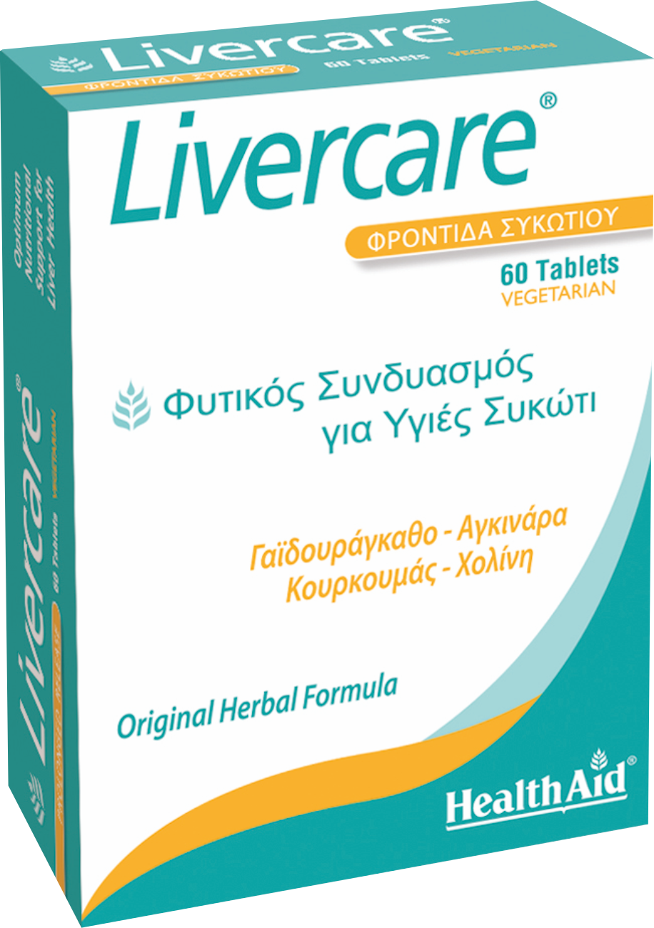Το συκώτι αποτελεί το μεταβολικό κέντρο του οργανισμού και είναι υπεύθυνο για το ‘’φιλτράρισμα’’ οποιασδήποτε ουσίας εισέρχεται σε αυτόν. Ο σύγχρονος τρόπος ζωής ή πιθανές παθολογικές καταστάσεις, το επιβαρύνουν περισσότερο, με αποτέλεσμα να χρήζει ειδικής διατροφικής υποστήριξης για να διατηρηθεί υγιές. Το Γαϊδουράγκαθο (Milk Thistle), πλούσιο σε sylimarin, προστατεύει τις μεμβράνες των ηπατικών κυττάρων και ενισχύει την αναγέννηση του ηπατικού παρεγχύματος που έχει υποστεί φθορά. Η Βερβερίς (Barberry) χρησιμοποιείται για τις τονωτικές, αντιμικροβιακές, αντιβιοτικές & πεπτικές της ιδιότητες. Ο Κουρκουμάς (Turmeric), χάρη στη sylimarin, δρα σαν αντιοξειδωτικό, αντιφλεγμονώδες και προστατευτικό του συκωτιού. Η Αγκινάρα (Artichoke) διαθέτει χολεκκριτικές ικανότητες, διευκολύνοντας την πέψη και ο Ταραξάκος (Dandelion) αποτελεί άριστο διουρητικό και αποτοξινωτικό. Λιποτροπικοί παράγοντες όπως Μεθειονίνη, Χολίνη & Ινοσιτόλη, συμβάλλουν στην παραγωγή λεκιθίνης για την μείωση του λίπους στο συκώτι, ενώ παράλληλα αυξάνουν την βιοδιαθεσιμότητα του Γαϊδουράγκαθου. Το Livercare της HealthAid αποτελεί μια προηγμένη σύνθεση με όλα τα παραπάνω συστατικά, για φυσική αποτοξίνωση και καθαρισμό του συκωτιού, απομακρύνοντας συσσωρευμένο λίπος και τοξίνες. Ιδανικό σε περιπτώσεις αλκοολικής ηπατίτιδας και κίρρωσης, λιπώδους διήθησης, ίκτερου και αυξημένων ηπατικών ενζύμων. Απαραίτητο σε όσους καταναλώνουν μεγάλες ποσότητες λιπαρών τροφών & αλκοόλ, σε όσους λαμβάνουν πολλά φάρμακα ή γυμναστηριακά σκευάσματα (στεροειδή), αλλά και για προετοιμασία του οργανισμού πριν από κάθε δίαιτα αδυνατίσματος.