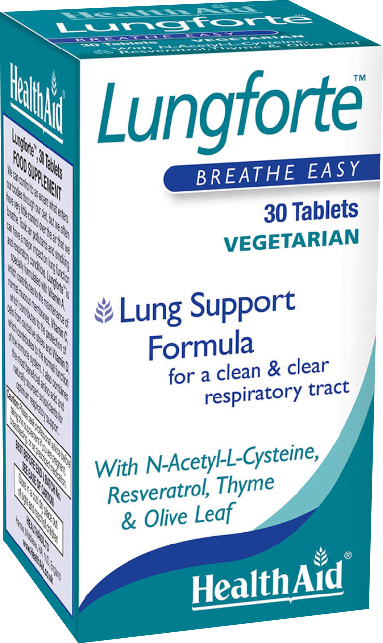 Μοναδικός συνδυασμός για τον καθαρισμό και την προστασία της αναπνευστικής οδού, καθώς και την θωράκιση του ανοσοποιητικού, καθώς ολόκληρο το αναπνευστικό μας σύστημα, από το ρινοφαρυγγικό μέχρι τους πνεύμονες, επιβαρύνεται καθημερινά από διάφορες αιτίες , με κίνδυνο την σταδιακά μειωμένη λειτουργία του. Το Εκχύλισμα φύλλων Ελιάς, πλούσιο σε Υδροξυτυροσόλη, στην οποία οφείλονται οι φυσικές αντιβιοτικές, αντισηπτικές και νευροπροστατευτικές του ιδιότητες, αποτελεί ισχυρό αντιοξειδωτικό στην υγεία του καρδιαγγειακού και των πνευμόνων, ενώ μελέτες έχουν αποδείξει την ευεργετική της δράση ακόμα και στους παθητικούς καπνιστές. Ν-Ακέτυλο-Κυστεΐνη(ΝΑC), με βλεννολυτικές ιδιότητες στον καθαρισμό των πνευμόνων, Κουερσετίνη για την προστασία του ρινοφαρυγγικού, Θυμάρι με αντιμυκητισιακή δράση και σκόρδο με βακτηριοστατικές και αντιμικροβιακές ιδιότητες. Περιέχει επίσης Ρεσβερατρόλη και βιταμίνη C για επιπλέον αντιοξειδωτική προστασία των κυττάρων, καθώς και τις Βιταμίνες Α & D3, για την διατήρηση της φυσιολογικής λειτουργίας των βλενογόννων και της αναπνευστικής οδού. Το Lungforte της HealthAid αποτελεί σύμμαχο στην υποστήριξη της εύρυθμης αναπνοής και της τόνωσης του ανοσοποιητικού για όλη τη διάρκεια του έτους. Ιδανικό για καπνιστές αλλά και πάσχοντες από αναπνευστικά προβλήματα, όσους ζουν και εργάζονται σε περιοχές με υψηλά ποσοστά ρύπανσης, αλλά και εκείνους που είναι επιρρεπείς σε λοιμώξεις του αναπνευστικού και εμφανίζουν συχνά βήχα και βλέννα.