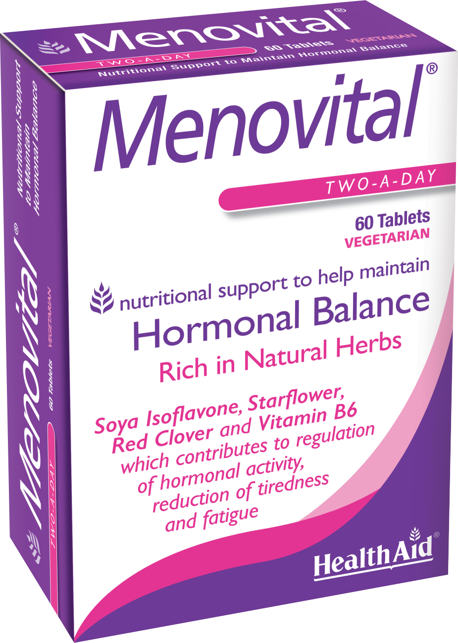 Επιστημονικά διαμορφωμένη σύνθεση, με φυτά που παραδοσιακά χρησιμοποιούνται για τις φυτοοιστρογονικές και εξισορροπητικές τους ιδιότητες, όπως Έλαιο Λιναρόσπορου (Flaxseed Oil), με δράση εξισορρόπησης των οιστρογόνων, βελτιώνει την κυκλοφορία του αίματος στα εσωτερικά γεννητικά όργανα (μήτρα-ωοθήκες), Λιγαριά (Agnus Castus) σαν διεργετικό παραγωγής προγεστερόνης, προλαμβάνει κολπικές μολύνσεις που συνήθως επιδεινώνονται λόγω του PH που γίνεται πιο αλκαλικό εκείνη την περίοδο και έτσι αυξάνεται η ευαισθησία στις μολύνσεις και στο περίβλημα της ουρήθρας. Αγγελική (Dong Quai), για εξομάλυνση των οιστρογόνων, που οφείλονται και τα συμπτώματα της εμμηνόπαυσης, όπως αναψοκοκκινίσματα, εφιδρώσεις, μελαγχολία. Black Cohosh με ανακουφιστικές ιδιότητες στην ξηρότητα του κόλπου, δυσπαρεύνια (πόνος κατά την σεξουαλική επαφή), ευερεθιστικότητα, αγγειοκινητικές εξάψεις, ακράτεια ούρων που μπορεί να είναι αποτελέσματα της ατροφίας του επιθήλιου της ουρογενετικής οδού από την χρόνια έλλειψη οιστρογόνων. Το Έλαιο Μποράγκου (Borage Oil) είναι πλούσιο σε Ω6 λιπαρά οξέα, τα οποία εμφανίζουν αντιφλεγμονώδεις, αντιθρομβωτικές και ορμονορυθμιστικές ιδιότητες. Ισοφλαβόνες Σόγιας για μείωση της συνθετικής ικανότητας παραγωγής λιπαρών οξέων και τριγλυκεριδίων, ενώ παράλληλα συμβάλλουν στην αύξηση καταστροφής (οξείδωση) των λιπών, κάτι που αποτελεί θετική επίδραση στο αδυνάτισμα και στο μεταβολισμό των λιπών. Το Menovital της HealthAid, περιέχει 16 διαφορετικά συστατικά, τα οποία δρουν συνεργιστικά στην αντιμετώπιση συμπτωμάτων της εμμηνόπαυσης, όπως νυχτερινές εφιδρώσεις, ξηρότητα κόλπου, αλλαγές διάθεσης κα. Η προσθήκη βιταμινών, μετάλλων και αμινοξέων, το καθιστούν ιδανικό για τις γυναίκες ηλικίας 45-65, που υποφέρουν από ψυχοσωματικές διαταραχές, λόγω όλων αυτών των ορμονικών αλλαγών.