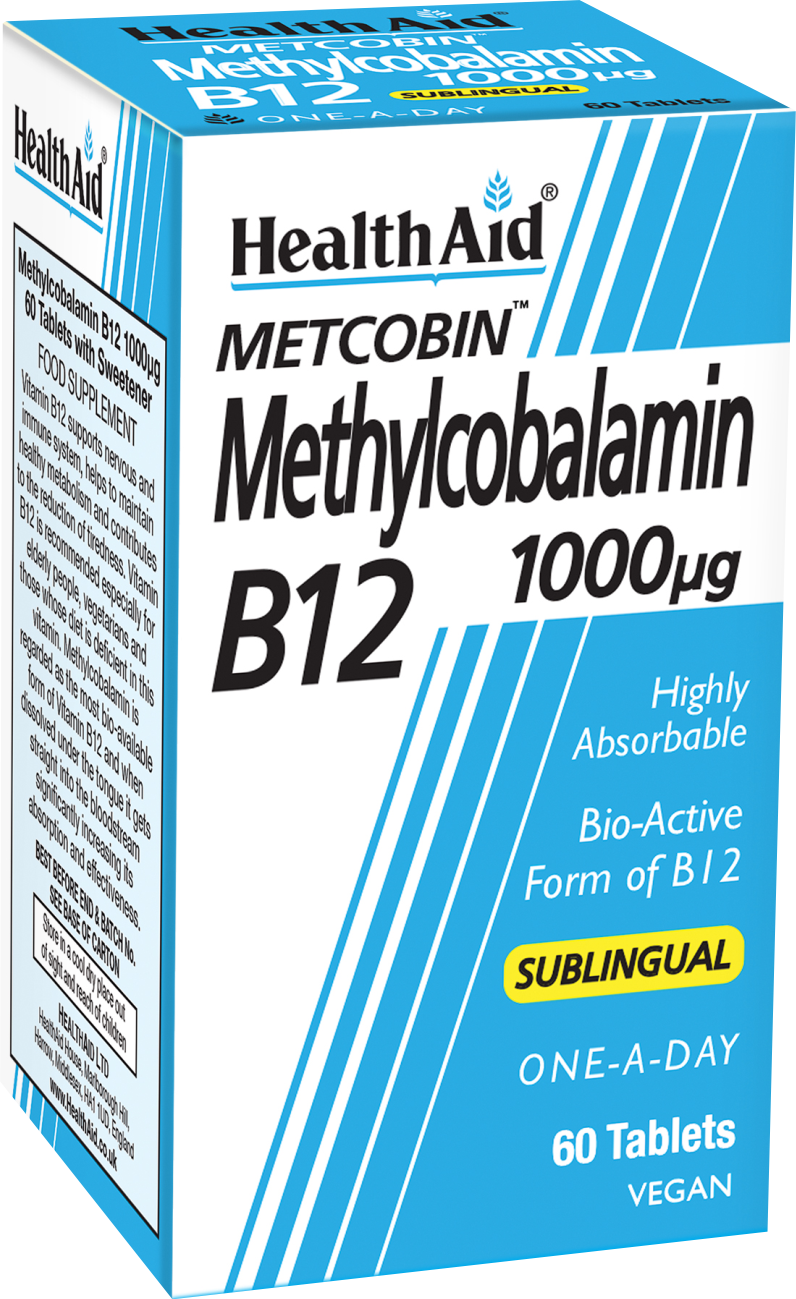 Η μεθυλκοβαλαμίνη είναι η ενεργή μορφή της βιταμίνης Β12. Συμβάλλει στην παραγωγή ερυθρών αιμοσφαιρίων, στην αύξηση των επιπέδων ενέργειας, στον υγιή μεταβολισμό λιπών, υδατανθράκων & πρωτεϊνών και στη φυσιολογική λειτουργία του νευρικού & ανοσοποιητικού συστήματος, στο μεταβολισμό της ομοκυστεΐνης για την υγεία της καρδιάς και στη μείωση της κούρασης και της κόπωσης. Η Metcobin B12 της HealthAid είναι σε μορφή υπογλώσσιου δισκίου. Όταν διαλύεται κάτω από τη γλώσσα απορροφάται καλύτερα από τον οργανισμό, χωρίς να χάνεται μέρος της από τη διαδικασία της πέψης, με αποτέλεσμα να είναι και πιο βιοδιαθέσιμη. Είναι κατάλληλη για φυτοφάγους, που δεν την λαμβάνουν από τη διατροφή, για όσους δεν μπορούν να καταπιούν ταμπλέτες, για διαβητικούς καθώς περιέχει ξυλιτόλη ως γλυκαντική ουσία, φιλική προς τα δόντια, με ευχάριστη γεύση φραγκοστάφυλου.