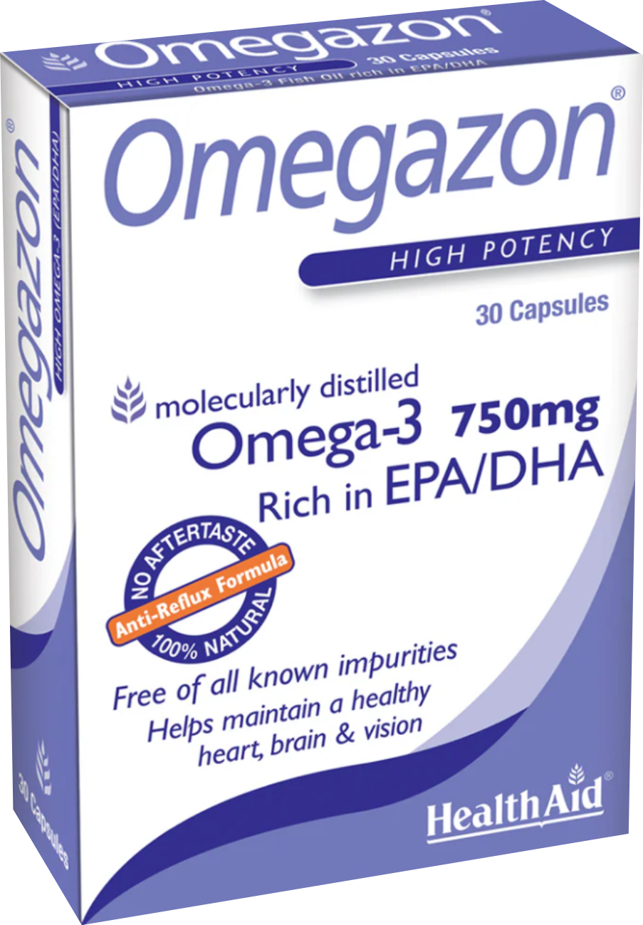 Απαραίτητα πολυακόρεστα λιπαρά οξέα, τα οποία δεν μπορεί να παράξει ο οργανισμός, αλλά τα χρησιμοποιεί σε πολλές μεταβολικές διεργασίες, καθώς επιδρούν στις κυτταρικές μεμβράνες. Υποστηρίζουν το υγιές κυκλοφορικό σε ολόκληρο το σώμα και ως εκ τούτου προωθούν την υγεία της καρδιάς, συμβάλλουν στη διατήρηση των εγκεφαλικών λειτουργιών(συγκέντρωση, διάθεση), της όρασης, καθώς και την ενίσχυση του ανοσοποιητικού. Παρεμβαίνουν στον μεταβολισμό των λιπιδίων, μειώνοντας τα τριγλυκερίδια & τη χοληστερίνη, ενώ παράλληλα καταπολεμούν τις φλεγμονές. Το Omegazon της HealthAid είναι ειδικά παρασκευασμένο από Νορβηγικά ιχθυέλαια διπλής μοριακής απόσταξης, απαλλαγμένα από διοξίνες, προσμίξεις ή βαρέα μέταλλα, ώστε ν’αποδίδει πλήρη συγκέντρωση ωφέλιμων λιπαρών οξέων EPA/DHA στην ελεύθερη & πιο καθαρή μορφή τους. Μοναδική Anti-Reflux σύνθεση, η οποία δεν αφήνει επίγευση ψαριού. Ιδανικό σε περιπτώσεις υπερτριγλυκεριδαιμίας, έλεγχο χοληστερίνης & αρτηριακής πίεσης καθώς και για φλεγμονώδεις καταστάσεις (αρθρώσεις).