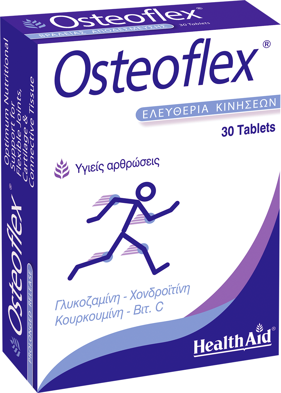 Ειδική σύνθεση Γλυκοζαμίνης & Χονδροϊτίνης σε ιδανική αναλογία (500mg/400mg), ευεργετική για την αντιμετώπιση της φθοράς, την συντήρηση και αναδόμηση των αρθρώσεων & των συνδέσμων, σε ταμπλέτες βραδείας αποδέσμευσης για συνεχή δράση και αναβράζοντα δισκία. Περιέχει: Γλυκοζαμίνη: Είναι αμινοσακχαρίτης και αποτελεί το κυριότερο συστατικό του αρθρικού υγρού. Απαραίτητη στο σχηματισμό γλυκοζαμινογλυκάνων (GAGs) για τη συνοχή των χόνδρων. Η φθορά των υπαρχόντων ιστών, ειδικά γύρω από τις αρθρώσεις, απαιτεί συνεχές «ξαναγέμισμα» με γλυκοζαμίνη σε καθημερινή βάση. Χονδροϊτίνη: Είναι γλυκοζαμινογλυκάνη φυσικά ευρισκόμενη στο χόνδρο. Έχει την ικανότητα να προσελκύει μόρια νερού, προσφέροντας ενυδάτωση & ελαστικότητα, ενώ παράλληλα εμποδίζει τη δράση ενζύμων που καταστρέφουν τον χόνδρο. Turmeric: Ρίζα κουρκουμά, πλούσια σε κουρκουμίνη, γνωστή για τις φυσικές αντιφλεγμονώδεις ιδιότητές της, ιδιαίτερα δραστική στους ώμους, τα γόνατα και τους αγκώνες. Βιταμίνη C: Απαραίτητη για τη διατήρηση και το σχηματισμό κολλαγόνου από τον οργανισμό. Μαγγάνιο: Μέταλλο, σημαντικό για την σκελετική ανάπτυξη. Έρευνες έδειξαν ότι άτομα με οστεοαρθρίτιδα, είχαν έλλειψη σε μαγγάνιο. Το Osteoflex της HealthAid σε ταμπλέτες βραδείας αποδέσμευσης, συνιστάται σε περιπτώσεις διαγνωσμένης οστεοαρθρίτιδας, μετεγχειρητικών καταστάσεων και αθλητικών τραυματισμών. Κατάλληλο για συστηματική αγωγή σε μεσήλικες και ηλικιωμένους.