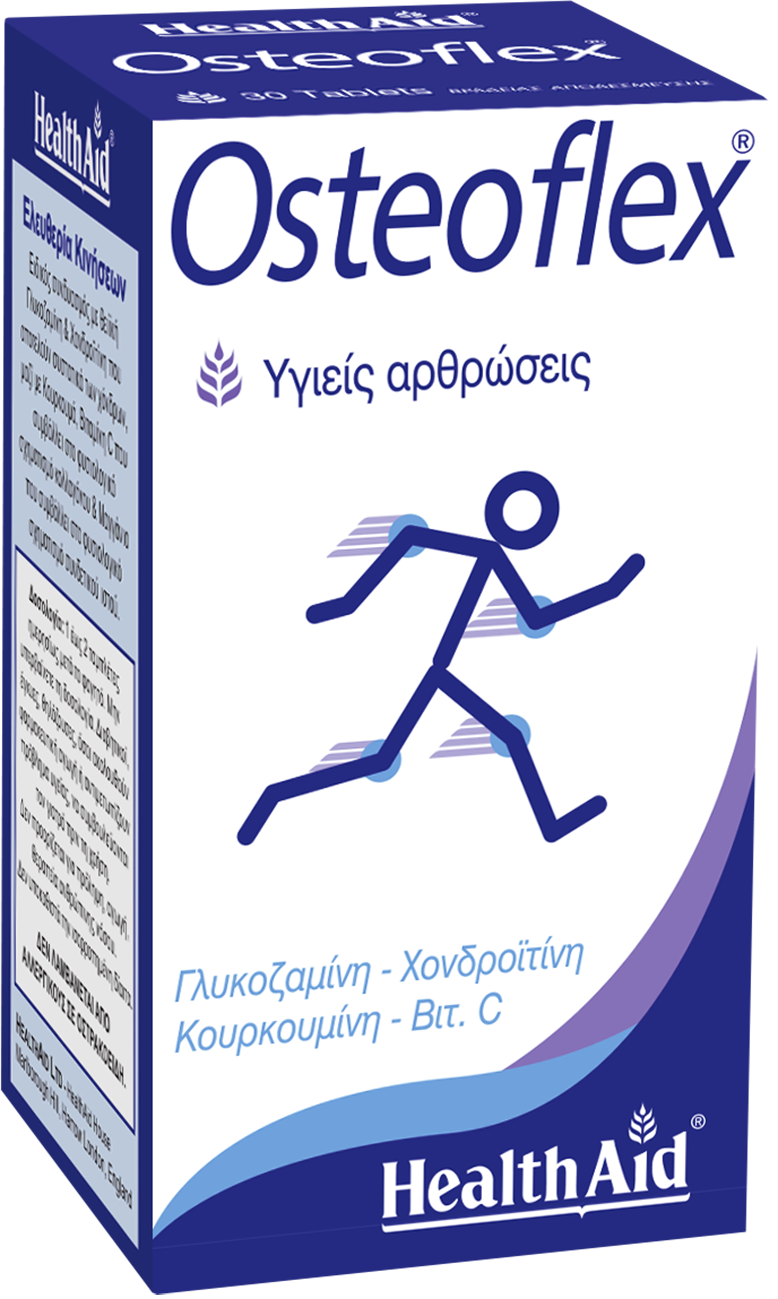 Ειδική σύνθεση Γλυκοζαμίνης & Χονδροϊτίνης σε ιδανική αναλογία (500mg/400mg), ευεργετική για την αντιμετώπιση της φθοράς, την συντήρηση και αναδόμηση των αρθρώσεων & των συνδέσμων, σε ταμπλέτες βραδείας αποδέσμευσης για συνεχή δράση και αναβράζοντα δισκία. Περιέχει: Γλυκοζαμίνη: Είναι αμινοσακχαρίτης και αποτελεί το κυριότερο συστατικό του αρθρικού υγρού. Απαραίτητη στο σχηματισμό γλυκοζαμινογλυκάνων (GAGs) για τη συνοχή των χόνδρων. Η φθορά των υπαρχόντων ιστών, ειδικά γύρω από τις αρθρώσεις, απαιτεί συνεχές «ξαναγέμισμα» με γλυκοζαμίνη σε καθημερινή βάση. Χονδροϊτίνη: Είναι γλυκοζαμινογλυκάνη φυσικά ευρισκόμενη στο χόνδρο. Έχει την ικανότητα να προσελκύει μόρια νερού, προσφέροντας ενυδάτωση & ελαστικότητα, ενώ παράλληλα εμποδίζει τη δράση ενζύμων που καταστρέφουν τον χόνδρο. Turmeric: Ρίζα κουρκουμά, πλούσια σε κουρκουμίνη, γνωστή για τις φυσικές αντιφλεγμονώδεις ιδιότητές της, ιδιαίτερα δραστική στους ώμους, τα γόνατα και τους αγκώνες. Βιταμίνη C: Απαραίτητη για τη διατήρηση και το σχηματισμό κολλαγόνου από τον οργανισμό. Μαγγάνιο: Μέταλλο, σημαντικό για την σκελετική ανάπτυξη. Έρευνες έδειξαν ότι άτομα με οστεοαρθρίτιδα, είχαν έλλειψη σε μαγγάνιο. Το Osteoflex της HealthAid σε ταμπλέτες βραδείας αποδέσμευσης, συνιστάται σε περιπτώσεις διαγνωσμένης οστεοαρθρίτιδας, μετεγχειρητικών καταστάσεων και αθλητικών τραυματισμών. Κατάλληλο για συστηματική αγωγή σε μεσήλικες και ηλικιωμένους.