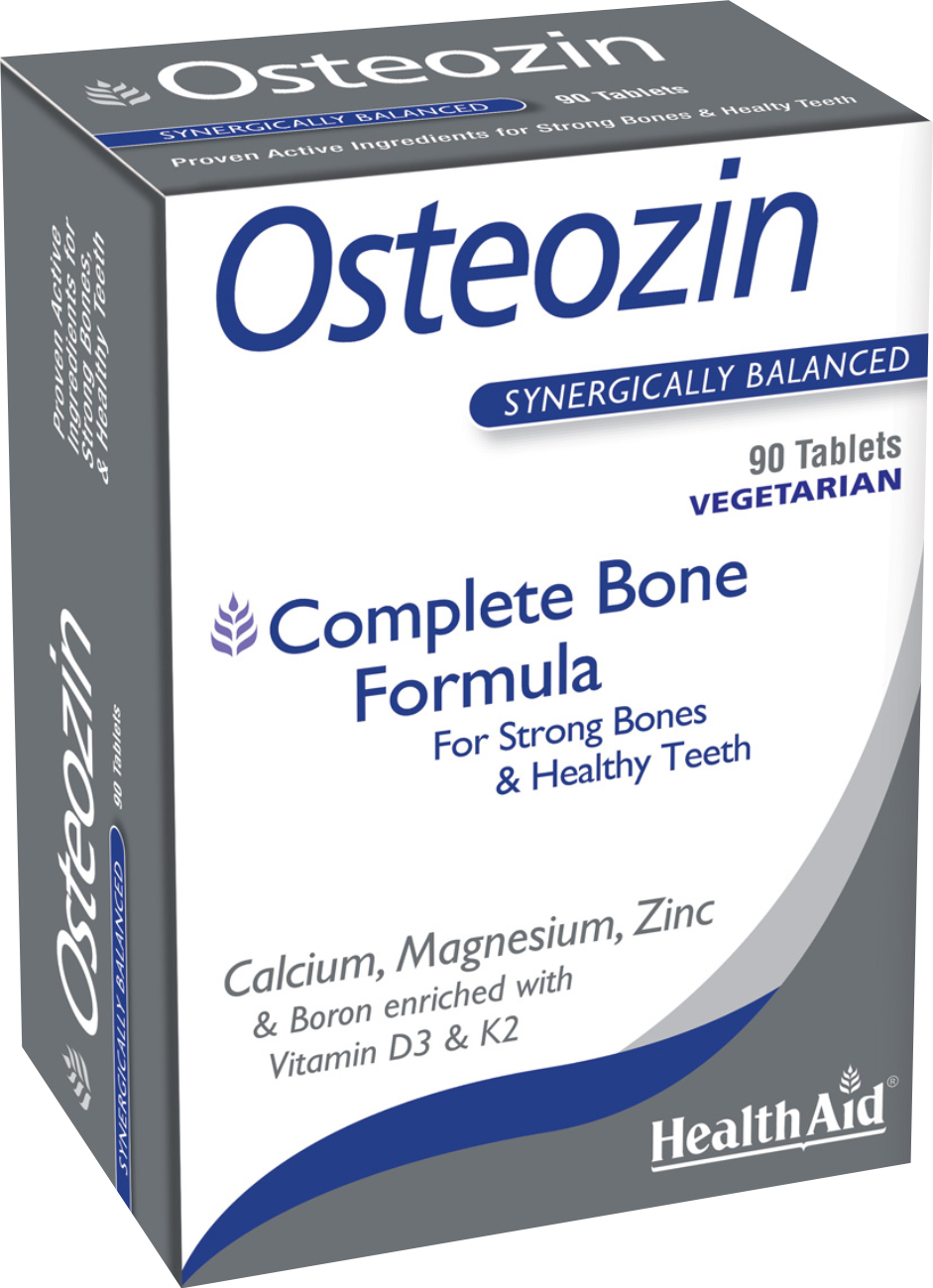 Τα οστά είναι ένας ζωντανός ιστός που συνεχώς δημιουργείται αλλά και καταστρέφεται. Όταν μειώνεται η πυκνότητα των οστών υπάρχει κίνδυνος για οστεοπενία και οστεοπόρωση. Για την πρόληψη και τη διατήρηση της φυσιολογικής κατάστασης των οστών, απαιτείται ασβέστιο ως βασικό συστατικό τους και μαγνήσιο, που είναι απαραίτητο για το μεταβολισμό του ασβεστίου και την υποστήριξη των μυών. Ο ψευδάργυρος συμμετέχει στη σύνθεση του DNA για την παραγωγή πρωτεϊνών που χρειάζονται για το σχηματισμό του οστού. Το βόριο εμποδίζει την απώλεια του ασβεστίου και οι βιταμίνες D3 & Κ2 είναι καθοριστικές για την απορρόφηση και την αξιοποίηση του ασβεστίου. Το Osteozin της HealthAid είναι ένας εξειδικευμένος συνδυασμός με όλα τα απαραίτητα συστατικά, τα οποία δρουν συνεργιστικά για τη μέγιστη υποστήριξη της υγείας των οστών, τη διατήρηση υγιών επιπέδων του ασβεστίου, τη μείωση απώλειας οστικής μάζας και την εύρυθμη λειτουργία του μυϊκού συστήματος. Ιδανικό για ηλικιωμένους, αθλητές σε μετατραυματικές καταστάσεις (κατάγματα) και γυναίκες ιδιαίτερα στην περίοδο της εμμηνόπαυσης.