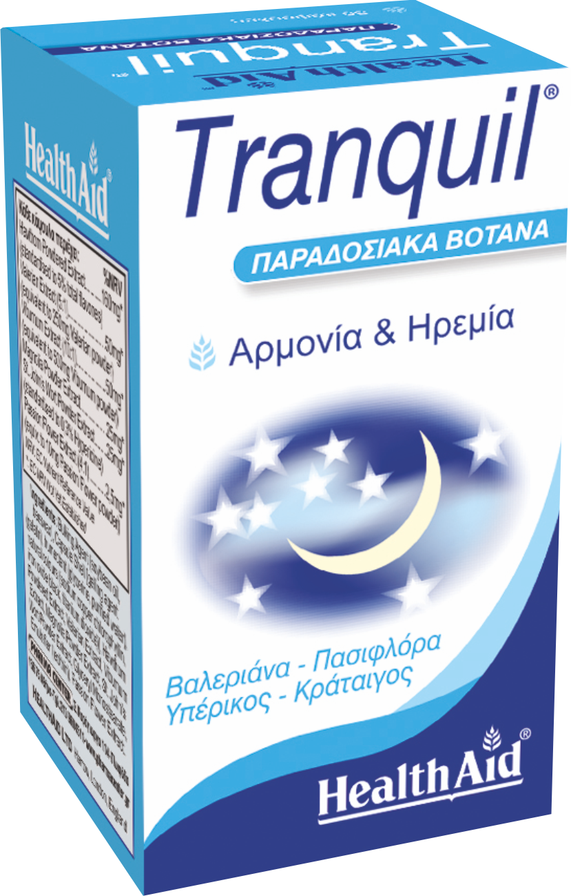 Ο ύπνος είναι ο φυσικός τρόπος για να ξεκουράζεται ο οργανισμός, ώστε ν’ αντιμετωπίζει την πίεση του σύγχρονου τρόπου ζωής. Σε περιόδους έντονου άγχους, δημιουργείται ένας φαύλος κύκλος, κατά τον οποίο ο ύπνος εμποδίζεται λόγω του υπερβολικού στρες κατά τη διάρκεια της ημέρας, αλλά και η έλλειψη ύπνου με τη σειρά της επιδεινώνει την καθημερινή ανησυχία και νευρικότητα. Ο Κράταιγος (Hawthorn) είναι ένα βότανο με καρδιοπροστατευτική δράση, καθώς χάρη στις ολιγομερείς προανθοκυανιδίνες που περιέχει, διεγείρει την παραγωγή μονοξειδίου του αζώτου (ΝΟ), με αποτέλεσμα τη διαστολή των αγγείων για καλύτερη αιματική ροή. Τα εκχυλίσματα Βαλεριάνας, Πασιφλόρας, Μανόλιας και Βιβούρνου, διαθέτουν κατευναστικές και υπναγωγές ιδιότητες, βοηθώντας στο καθημερινό άγχος. Το Υπέρικο (St’ John’s Wort) χρησιμοποιείται παραδοσιακά για τις ηρεμιστικές και αντικαταθλιπτικές του ιδιότητες. Το Tranquil της HealthAid είναι συνδυασμός από εκχυλίσματα των βοτάνων αυτών, τα οποία δρουν συνεργιστικά, βοηθώντας τον οργανισμό να ανταπεξέλθει στο καθημερινό άγχος, την νευρικότητα και την ανησυχία, χωρίς να προκαλεί εθισμό και τις συνηθισμένες παρενέργειες των φαρμάκων.