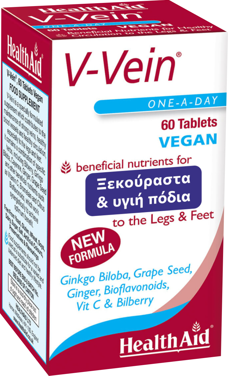 Αποτελεσματική και ολοκληρωμένη σύνθεση με 8 φυσικά συστατικά, για την ανακούφιση των άκρων και ειδικά των ποδιών από τα προβλήματα που προκαλεί η κακή κυκλοφορία του αίματος, όπως οίδημα, αίσθημα βάρους, κούραση, πόνο κ.α. Περιέχει Ginkgo Biloba, το οποίο αυξάνει την αιματική ροή σε ολόκληρο το σώμα, Βιοφλαβονοειδή Κίτρου για ενίσχυση αιμοφόρων αγγείων μέσω προστασίας των τριχοειδών, εκχύλισμα σπόρων σταφυλιού πλούσιο σε πολυφαινόλες και προανθοκυανιδίνες, για αύξηση της ελαστικότητας των αγγείων και την προώθηση της αιματικής ροής, μύρτιλο (bilberry) & Βιταμίνη C με αντιοξειδωτικές ιδιότητες για την εξουδετέρωση των ελευθέρων ριζών και Ginger, πιπέρι Cayenne & Βρωμελίνη, με φυσικές αντιφλεγμονώδεις ιδιότητες για την τόνωση του κυκλοφορικού. Το V-Vein της HealthAid διατηρεί υγιές το κυκλοφορικό σύστημα, προωθώντας τη σωστή αιματική ροή. Προλαμβάνει τον σχηματισμό κιρσών, φλεβίτιδων & ευρειαγγειών και αντιμετωπίζει δραστικά την κούραση και τον πόνο στα πόδια. Ιδανικό για όσους βρίσκονται σε συνεχή ορθοστασία και ακινησία, για όσους εκτίθενται σε υψηλές θερμοκρασίες και όσους εμφανίζουν συχνές κατακρατήσεις υγρών και πρήξιμο στα πόδια, ιδιαίτερα τους καλοκαιρινούς μήνες. Κατάλληλο για γυναίκες και άνδρες.