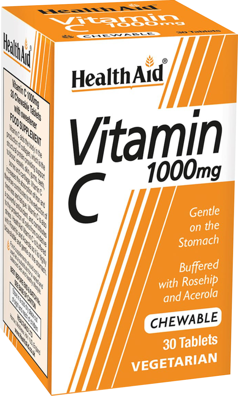 Η Βιταμίνη C είναι απαραίτητη για ένα υγιές ανοσοποιητικό, με αντιοξειδωτικές & αντιφλεγμονώδεις ιδιότητες και είναι αποτελεσματική στη διατήρηση της υγείας των κυττάρων, των αγγείων, των συνδετικών ιστών και των οστών. Προστατεύει την υγεία των δοντιών & ούλων, ιδιαίτερα στη μασώμενη μορφή της και διατηρεί την ελαστικότητα του δέρματος (παραγωγή κολλαγόνου). Απαραίτητη στους καπνιστές (ανεπάρκεια 200%-400% μεγαλύτερη από τους μη καπνιστές). Η Βιταμίνη C της HealthAid είναι εμπλουτισμένη με καρπό αγριοτριανταφυλλιάς & ασερόλα, αποδίδοντας παραπάνω ποσότητες βιταμίνης C και αυξάνοντας παράλληλα το ποσοστό απορρόφησής της από τον οργανισμό. Ως υδατοδιαλυτή βιταμίνη δεν αποθηκεύεται στον οργανισμό και έτσι συνιστάται η καθημερινή λήψη της για την υγιή λειτουργία του. Ιδανική μορφή για όσους δεν μπορούν να καταπιούν ταμπλέτες.