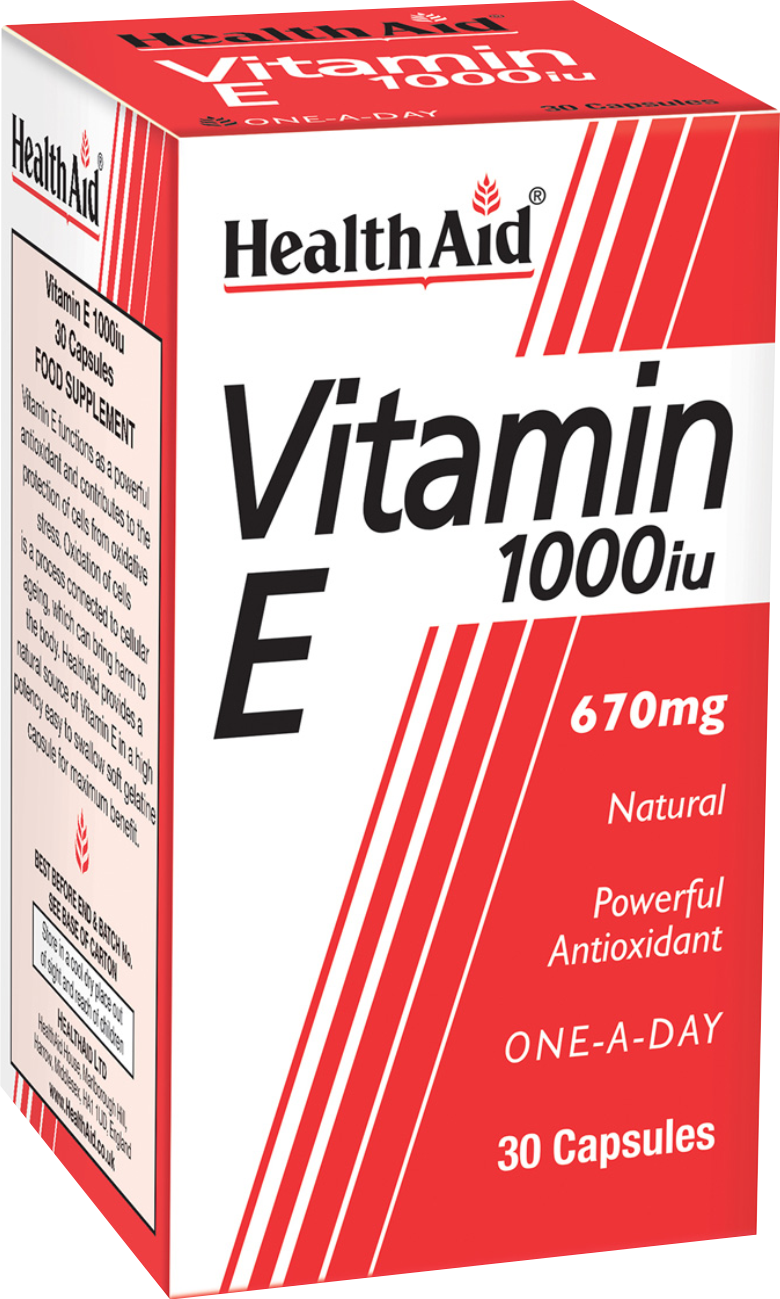 Λιποδιαλυτή βιταμίνη, γνωστή και ως παραγωγική (Τοκοφερόλη, η φέρουσα τον τόκο), δρα ως ένα από τα σημαντικότερα διατροφικά αντιοξειδωτικά κατά των ελευθέρων ριζών για την προστασία των κυτταρικών μεμβρανών και των λιποπρωτεϊνών. Επίσης εμποδίζει την οξείδωση πολλών θρεπτικών συστατικών, όπως τα Ω3 λιπαρά οξέα. Λόγω αυτής της ικανότητας, οι προτάσεις λήψης της καλύπτουν ένα μεγάλο φάσμα ενδείξεων. Οι Vitamins E της HealthAid περιέχουν τη βιταμίνη στη φυσική της μορφή (d-alpha tocopherol), δραστικότερη κατά 33% από τη συνθετική, χρήσιμη για υγιή ερυθρά αιμοσφαίρια, καθώς τα προστατεύει από ουσίες όπως το υπεροξείδιο του υδρογόνου στο αίμα. Συμβάλλει στην υγεία του καρδιαγγειακού και ιδιαίτερα σε άτομα με αυξημένη πιθανότητα εμφάνισης στεφανιαίας νόσου, αλλά και σε περιπτώσεις ορθοστατικής υπότασης. Βοηθά στην καλύτερη κυκλοφορία του αίματος και στον έλεγχο της χοληστερίνης και κρίνεται απαραίτητη η λήψη της σε άτομα που λαμβάνουν στατίνες, διότι αυτές μειώνουν την αντιοξειδωτική της ισχύ. Επίσης προστατεύει τους πνεύμονες από την ατμοσφαιρική ρύπανση, τροφοδοτεί με οξυγόνο το σώμα και επιβραδύνει τη γήρανση. Ελαττώνει τις εξάψεις κατά το προεμμηνορροϊκό σύνδρομο & εμμηνόπαυση και βοηθά σε περιπτώσεις γεροντικής εκφύλισης ωχράς κηλίδας. Μπορεί να χρησιμοποιηθεί και εξωτερικά, τρυπώντας την κάψουλα, σε εκζέματα, εγκαύματα αλλά και σαν καλλυντικό, με αντιγηραντικές & αναπλαστικές ιδιότητες (serum).